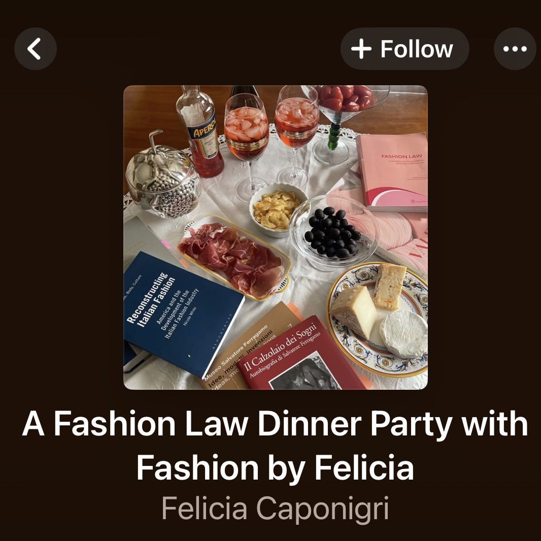 In the podcast A Fashion Law Dinner Party Felicia Caponigri discusses cutting-edge topics in fashion design with archivists, curators, lawyers and other fashion law experts.