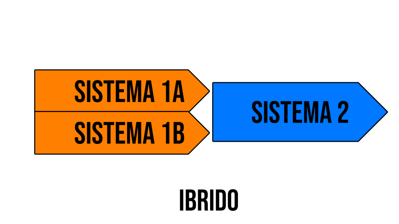 Nel modello ibrido, il sistema 2 si attiva dopo il sistema 1 come in quello in serie. Il sistema 1 però è più complesso di quello classico, ed è ora composto da due sottosistemi: quello di tipo A, più euristico, “di pancia”; quello di tipo B, più logico. Esistono infatti delle forme di ragionamento logico intuitive, a cui possiamo accedere velocemente e intuitivamente.